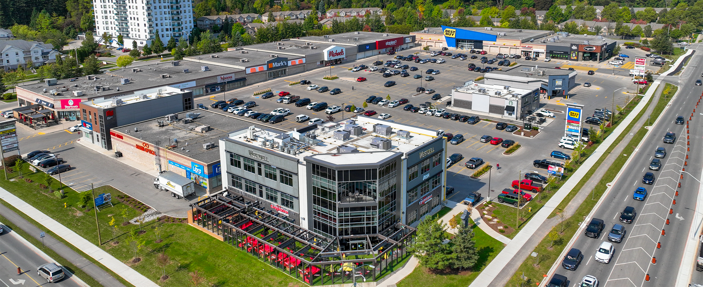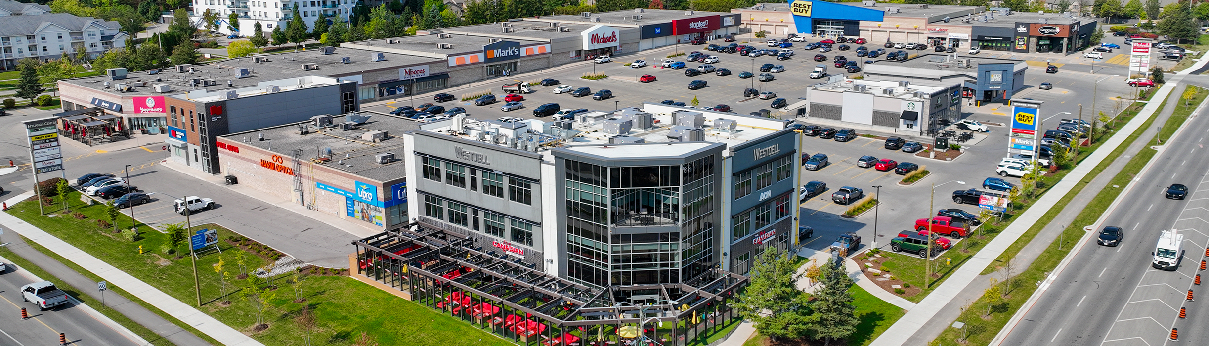 Situated in north London, the Richmond Hyland Centre is located in Masonville, the city’s most affluent and sought-after community. This regional hub is strategically located at the primary intersection of Fanshawe Park Road and Richmond Street. Located directly opposite Masonville Place, and just north of Western University (Ontario’s second largest University) this strategic area boasts a diverse range of tenants. Nearby retailers include SilverCity, Loblaws, LCBO, Farm Boy, Indigo, Winners, and HomeSense. The dining options are equally varied, featuring popular restaurants like The Keg and Milestones, alongside several fast- food establishments including Chick-FIl-A. Richmond Hyland Centre is anchored by well-known retailers such as Best Buy, Staples, Michaels, Goodness Me, Wingstop, and Starbucks.